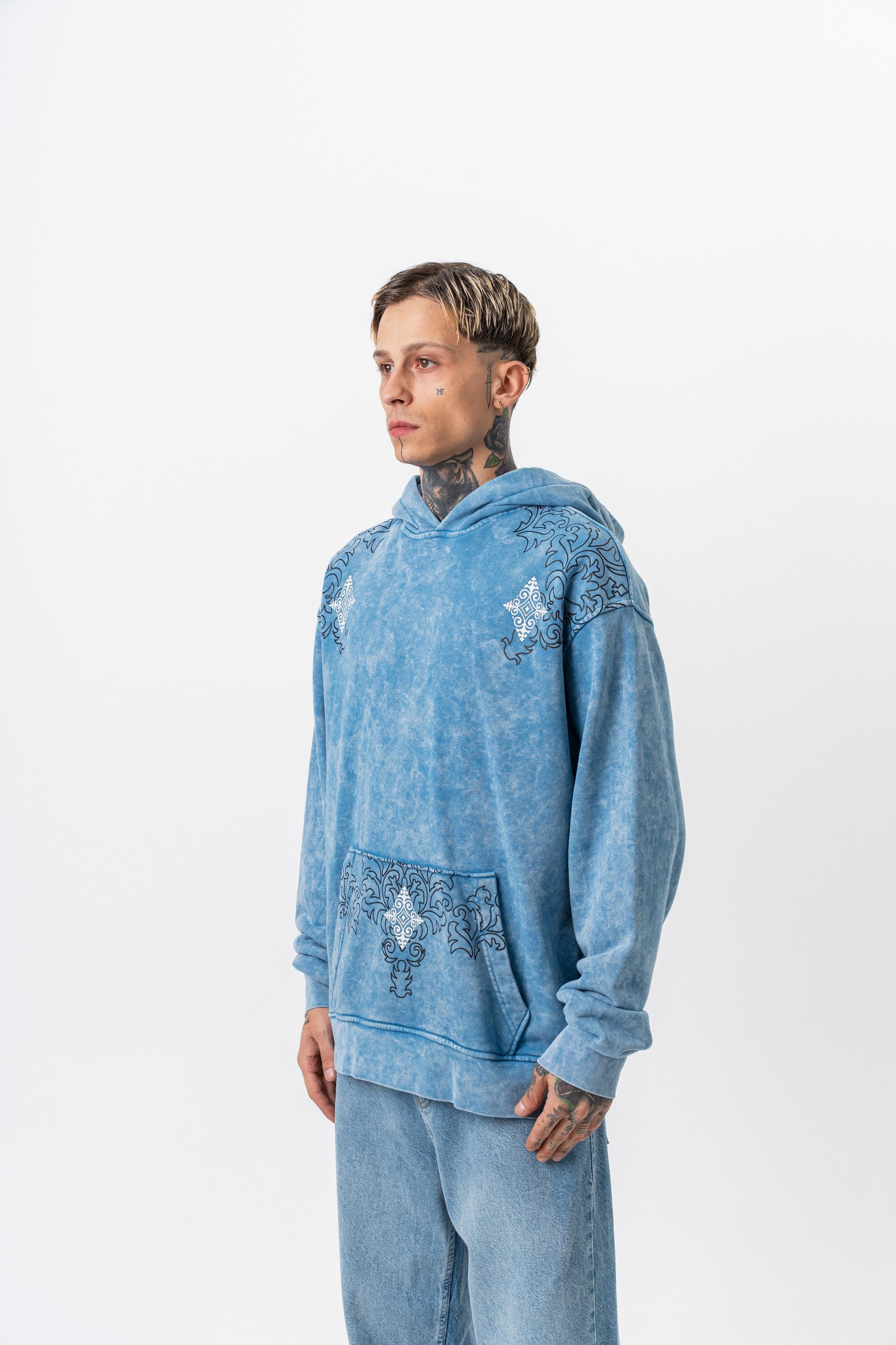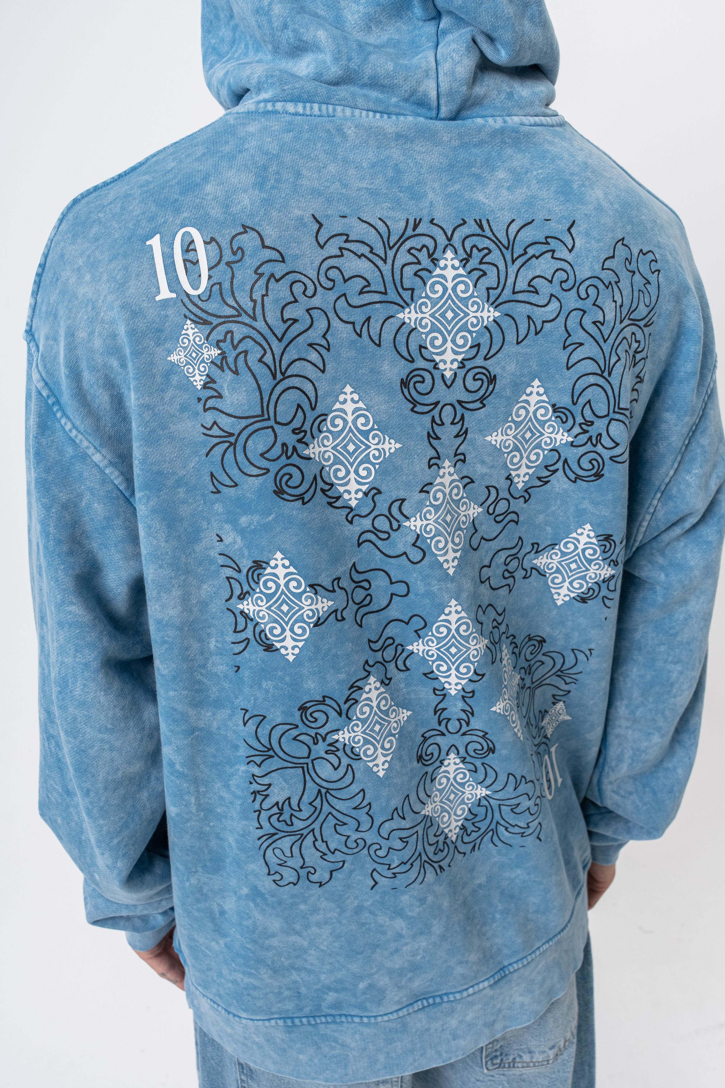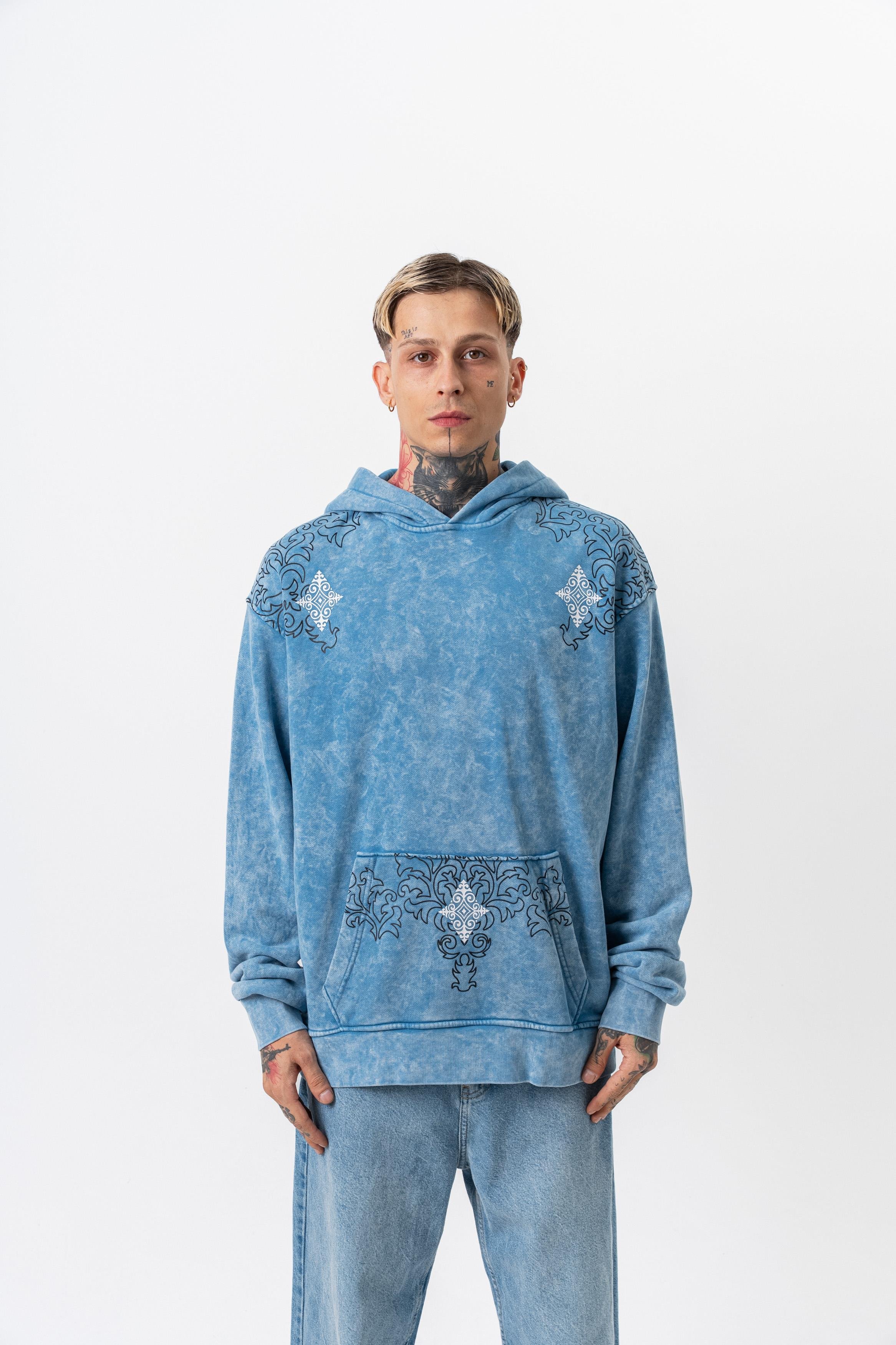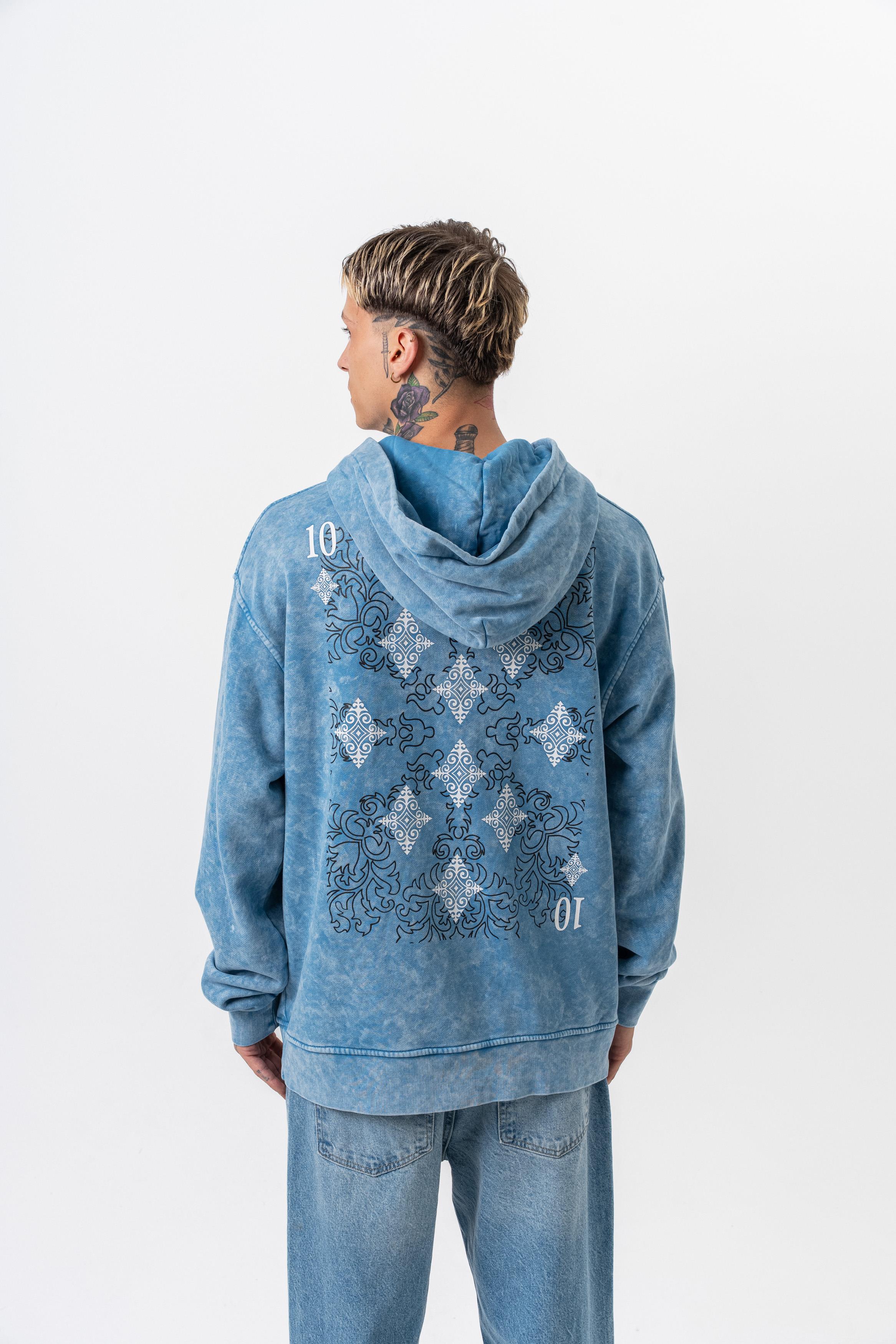 Erkek 10 Baskılı Yıkamalı Kapüşonlu Oversize Hoodie Mavi (56261022Mavi)