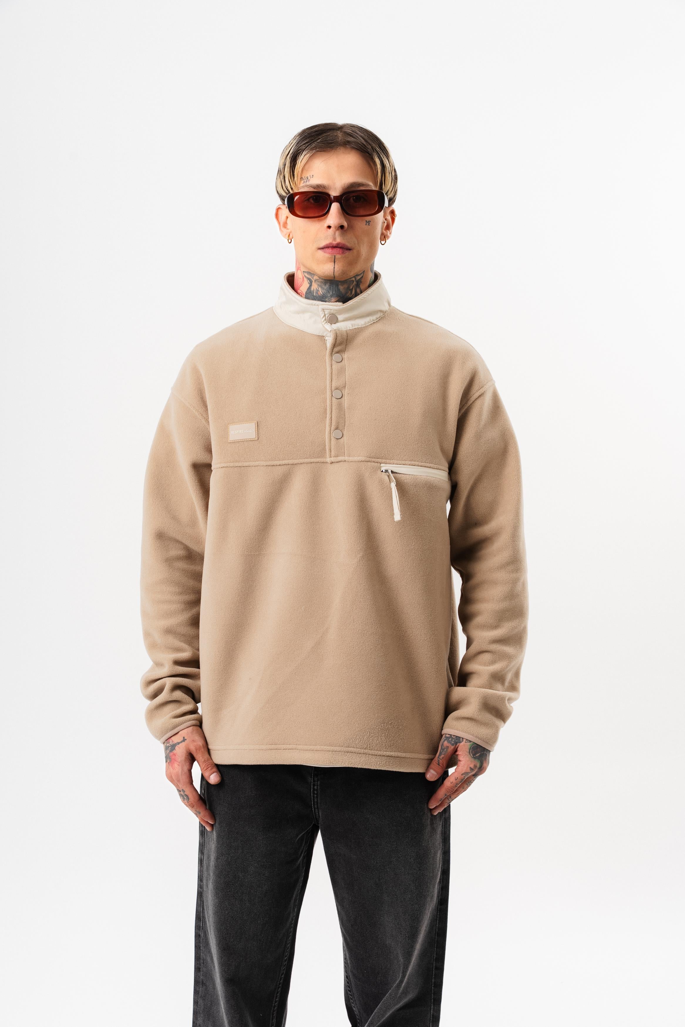 Erkek Düğme Detaylı Oversize Polar Sweatshirt Bej (56261055Bej)